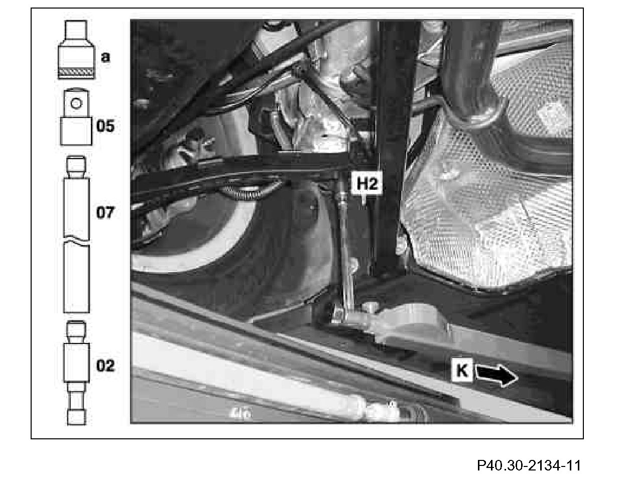 1 Measure reference dimension (H1) from check bore (K) to tie rod mounting on wheel carrier. Measure on the left and right side in each case.