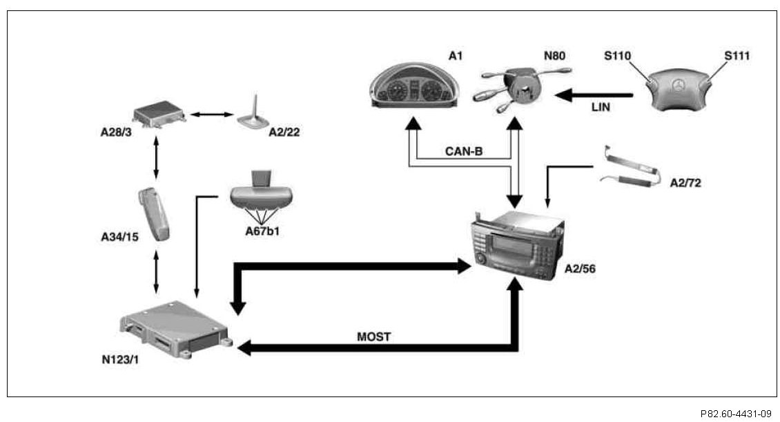 All control signals and useful signals (e.g. sound signals with hands- free system activated) are transmitted with the aid of the Media Oriented System Transport (MOST).