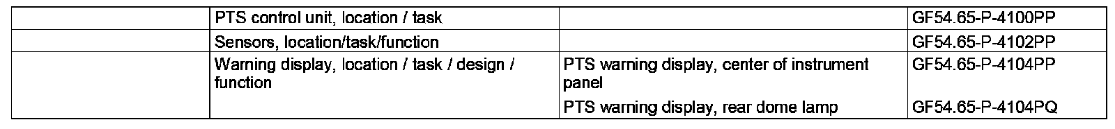When functioning correctly the center instrument panel PTS warning indicator (A44/4) and the Rear dome lamp PTS warning indicator (A44/3) is actuated for approx. 1 second, i.e. all the frames and segments light up with a background illumination of 60%.