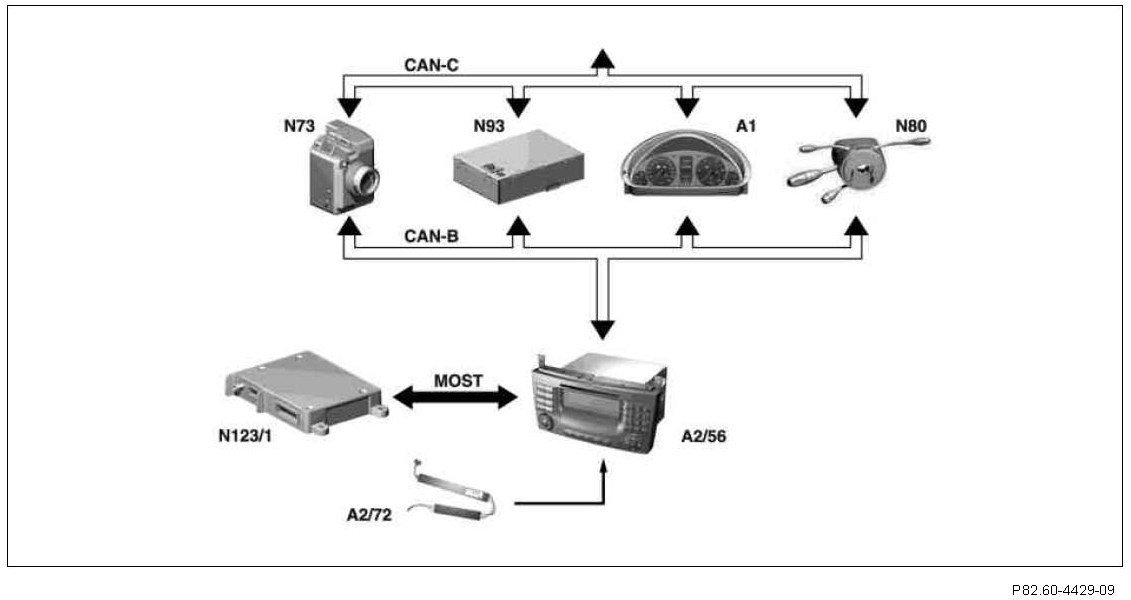 Data is exchanged between the radio and navigation unit (A2/56) and the instrument cluster (A1) via the CAN-B.