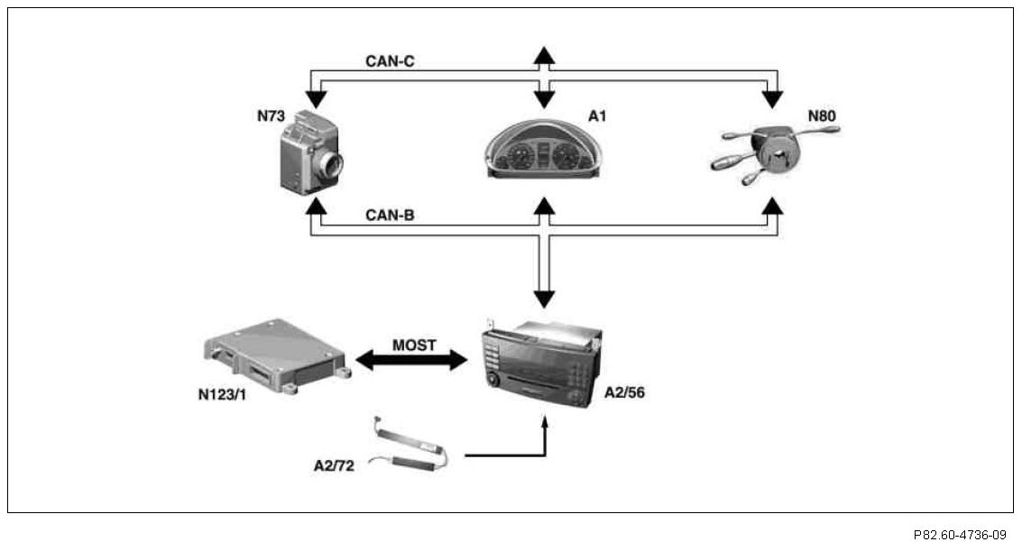 The radio and navigation unit (A2/56) has its own fault memory. When the fault memory is interrogated using STAR DIAGNOSIS, the data are transmitted to the radio and navigation unit (N2/56) via the MOST and can then be read out via the CAN-B by the central gateway control unit (N93) (up to 30.11.04) or from the EIS control unit (N73) (as of 1.12.04).