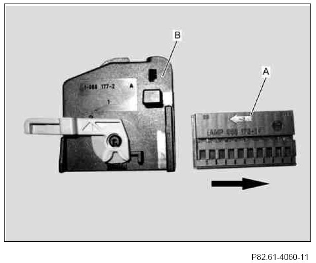 1 Remove connector housing (A) over the catch resistance in the direction of the arrow from the cap (B). Remove connector housing (A) from cap (B) in direction of arrow.