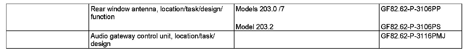 The high-frequency signals required for radio operation are received over the 4 FM antennas and an AM antenna on the rear window. The antennas are connected to the window antenna amplifier module 1 (A2/71) (model 203.2) and window antenna amplifier module 2 (A2/72) (models 203.0/7). The music, voice and/or data signals are modulated upon these high-frequency signals. The amplifier modules filter the frequencies from the radio frequency bands out of the radio frequency signals received and amplify them. The amplified signals are then transferred to each radio tuner (AM or FM) in the audio gateway control unit (N93/1) by a coaxial cable (AM, FM). The radio tuner demodulates the high-frequency signals. In doing so the useful information (audible frequency) is separated from the carrier signal (inaudible frequency). An audio signal amplifier integrated into the audio gateway control unit (N93/1) amplifies the demodulated audio signals and emits them over the vehicle speakers.