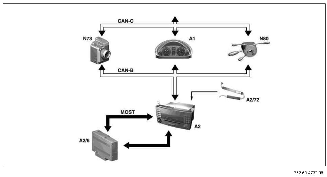 The control signals from the radio (A2) as well as the audio data from the CD player with changer (in the glove compartment) (A2/6) are transmitted by the Media Oriented System Transport (MOST). The signals are processed and amplified by the radio (A2). CD player mode is selected at the radio (A2) in the "Audio CD" menu. After inserting the changer magazine having at least one audio CD into the insertion slot of the CD player with changer (in the glove compartment) (A2/6), the following functions are available to the user: