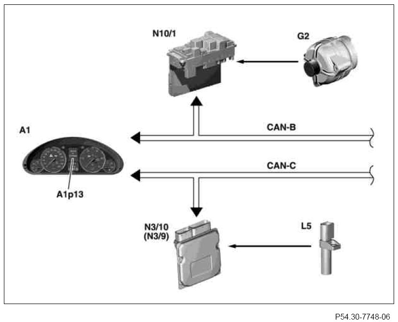 - The engine speed is read in via the pulses of the crankshaft position sensor (L5) by the CDI control unit (N3/9) or the ME control unit (N3/10) and is placed on the CAN-C.