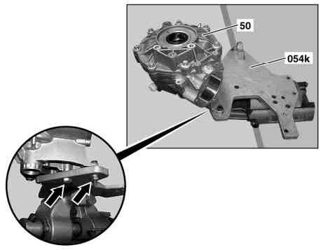 Attach front axle gear (50) to assembly plate (054k) of repair stand (arrows).