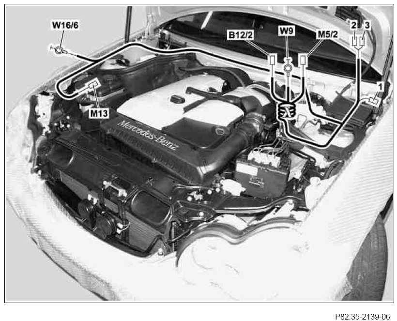 12 Insulate tie-outs for pressure and temperature sensor (B12/2), HCS pump (M5/2) and ground (left headlamp unit) (W9), tie and route to area below master brake cylinder.