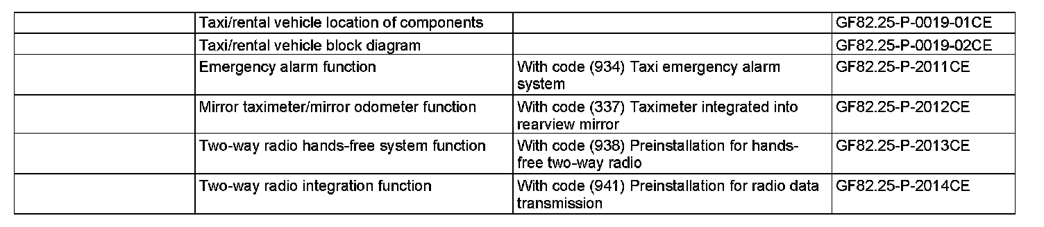 The taxi/rental vehicle base function (with code (965) Electrical preinstallation for rental vehicles) contains the special-purpose vehicle multifunction control unit (N26/9) to control and monitor various functions, the taxi two-way radio speaker (H6) and a specific vehicle wiring harness that enables the following equipment to be integrated into the system:
