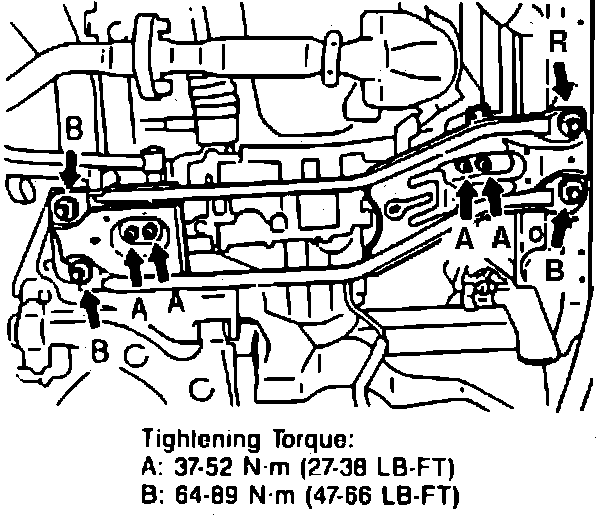 5. Loosen front crossmember bolts and nuts from front transaxle mount and vehicle frame, then lower rear end of crossmember.