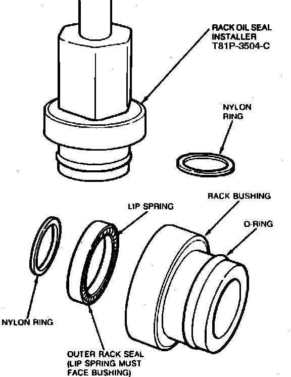 2. Slide teflon ring installation tool No. T81P-3504-L or equivalent over plain end of rack up to piston.