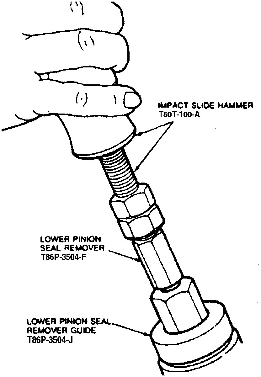 11. Remove lower pinion shaft seal using Seal Removal Tools T86P-3504-F, T86P-3504-J and T50T-100-A, or equivalents.