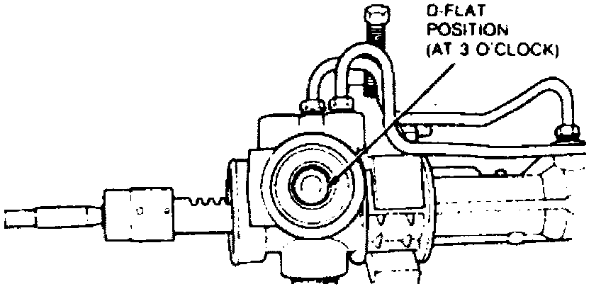 12. Position D-flat on input shaft at the 3 o'clock position and insert valve assembly into bore. The D-flat surface must be at the 3 o'clock position in the vehicle with the gear on center position. Rotate input shaft slightly, if necessary, to mesh the pinion with the rack teeth.