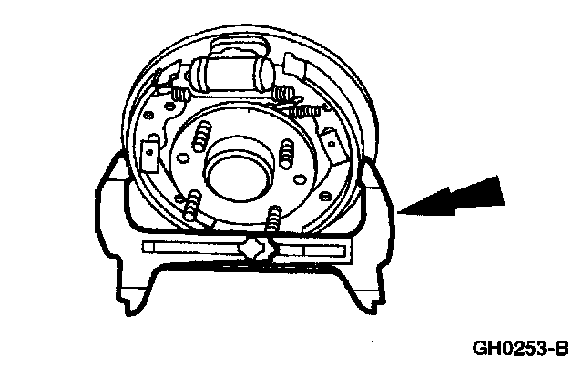 8. If the rear brake shoes and linings are to be reused, inspect and measure the thickness of the linings. If the linings are worn beyond the minimum thickness specification, replace them.