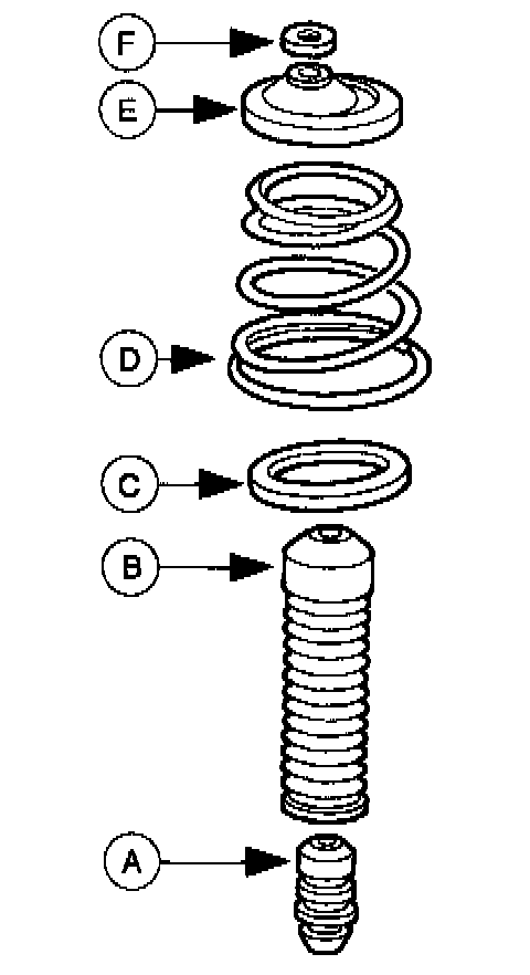 4. Remove the (A) bound stopper, (B) dust boot, (C) rubber spring seat, (D) spring, (E) upper spring seat, and (F) thrust bearing.