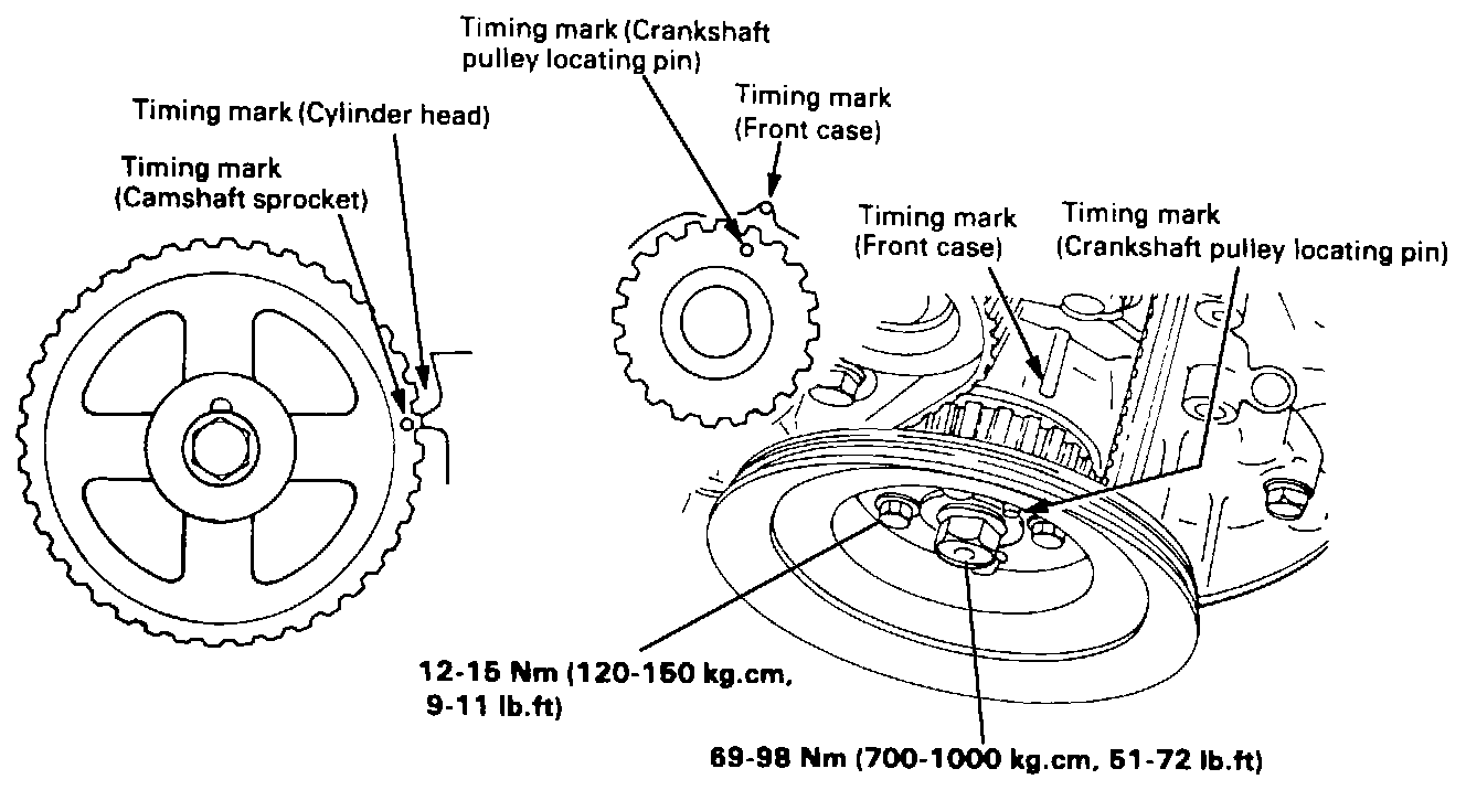 7. Install the timing belt on the camshaft sprocket. When the timing belt is installed on the camshaft sprocket, make sure that the tension side is tight. Then, check to ensure that when the tension side is tightened by turning the camshaft sprocket in a reverse direction, all timing marks are in line.