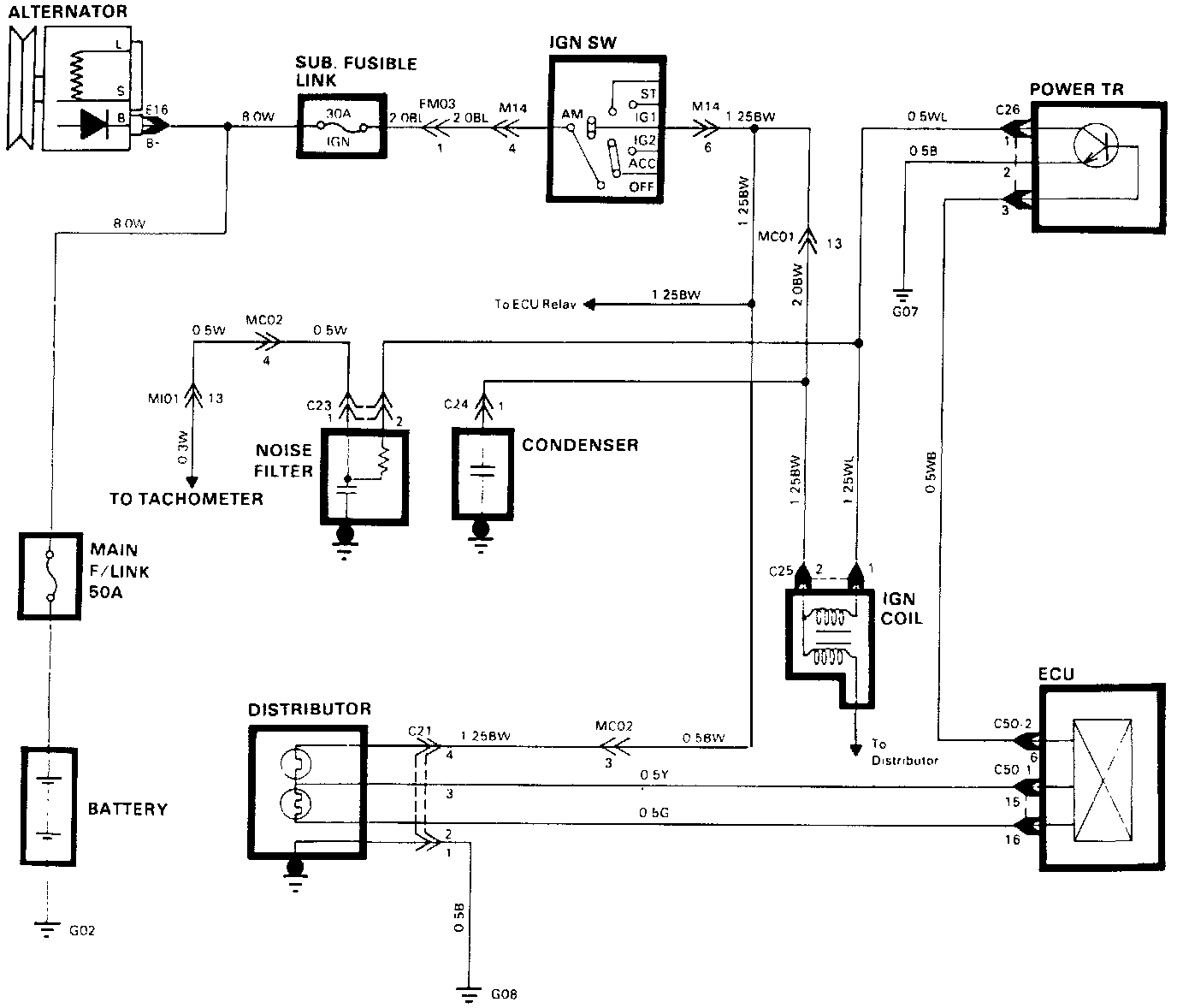 When the ignition key is turned on, battery voltage is supplied to the positive side of the primary and secondary windings of the ignition coil. As the engine begins to turn, the crank angle sensor determines the engine rpm and camshaft position and sends this information to the ECU. Based upon a determination made by several sensors as to the proper ignition timing requirements, the ECU then supplies a pulsed ground signal to the base of the power transistor. The power transistor cuts the voltage to the primary windings in the ignition coil. This causes the magnetic field surrounding the primary windings to collapse and a voltage surge is created in the secondary windings of the ignition coil. High voltage (approximately 20,000 volts) flows out of the coil, through the coil wire and into the center electrode of the distributor cap. Inside the distributor is a shaft that is spinning at 1/2 of the engine speed (same speed as the camshaft). Mounted to the top of this shaft is the distributor rotor. The voltage then passes to the distributor rotor through the spring loaded carbon point. The rotor then conducts the voltage to 1 of 4 electrodes in the distributor cap, depending upon rotational position. The voltage passes out of the distributor, into the ignition wire and into the corresponding spark plug. The voltage then jumps the gap at the spark plug electrode completing the path to ground, igniting the fuel mixture.