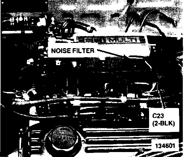 To test a suspected malfunctioning noise filter, unplug the noise filter connector (C23) and try to start the engine. If the engine starts with the noise filter unplugged, but will not run with it connected, the noise filter is faulty. Replace the noise filter to correct the condition.