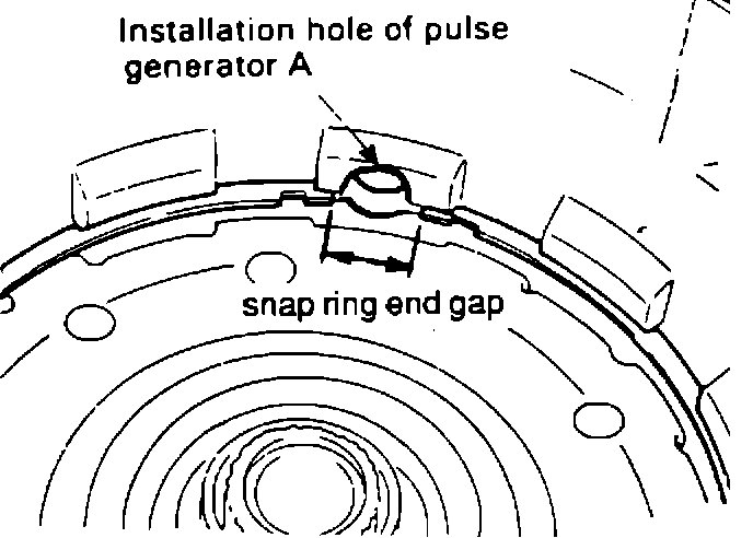 This bulletin is issued to emphasize the importance of the special care that must be taken when installing the Center Support Snap Ring. The snap ring end gap must be positioned over the hole for pulse generator A, as shown below in Figure 1. If the snap ring is improperly positioned the pulse generator pushes the snap ring out of position contacting the 2nd gear band. This will damage the pulse generator and transmission internal components. As reference to this bulletin please whte the TSB numbers in the boxes at the bottom of the affected pages.