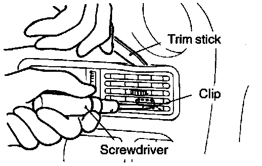 Disengaging the clips (2 positions) of the center air outlet assembly with a flat tip screwdriver, remove the center air outlet assembly with a plastic trim stick.