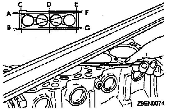 2. Using a straightedge and feeler gauge, check the block top surface for warpage. Make sure that the surface is free from gasket chips and other foreign matter.
