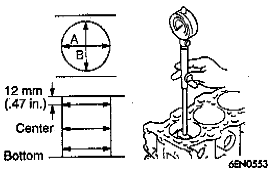 5. Using cylinder gauge, measure the cylinder bore and cylindricity. If worn badly, correct cylinder to an oversize and replace piston and piston rings. Measure at the points shown in illustration