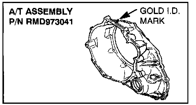 On remanufactured A/T assembly p/n RMD973041, there is round gold identification mark on the torque converter housing as shown in the illustration.