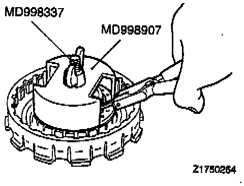 1. Check clearance between the snap ring and clutch reaction plate. To check the clearance, hold entire circumference of the clutch reaction plate down with 50 N (11 lbs.) force. If clearance is out of standard value, select a snap ring to obtain the standard value.