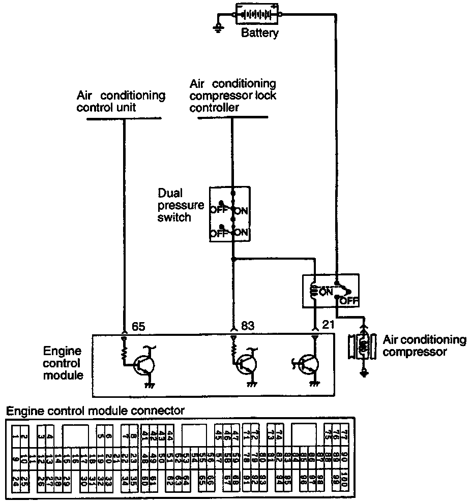 - When the air conditioning ON signal is input, the engine control module drives the idle air control motor and turns ON the power transistor. As a result, the air conditioning power relay coil is energized to turn on the relay switch, which activates the air compressor magnetic clutch.