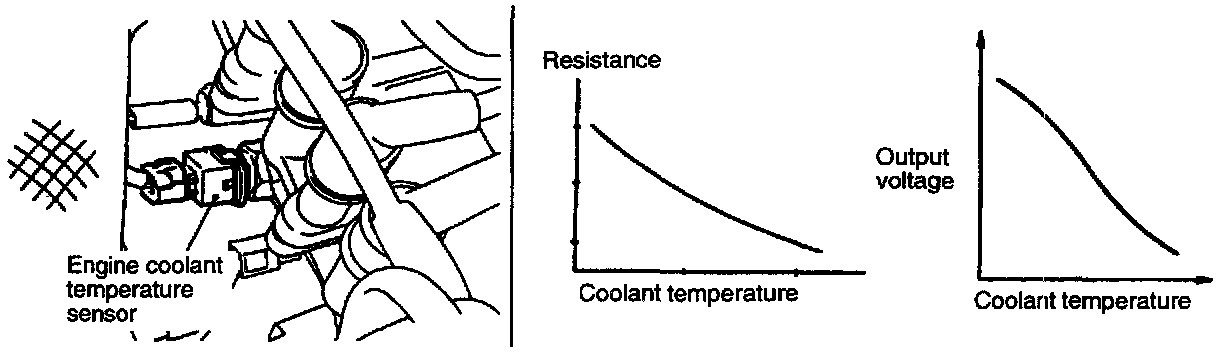 - The engine coolant temperature sensor converts the engine coolant temperature into a voltage and inputs it to the engine control module, which then controls the fuel injection rate and fast idle speed when the engine is cold based on the input signal.