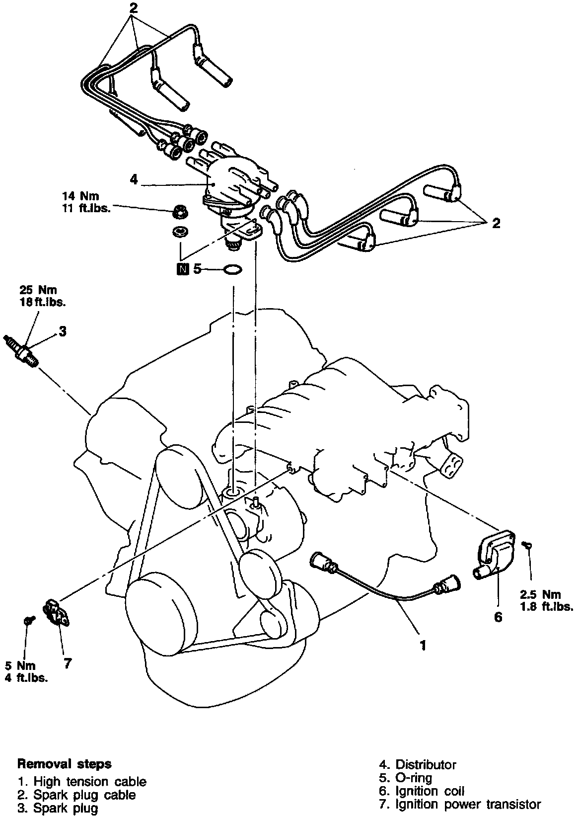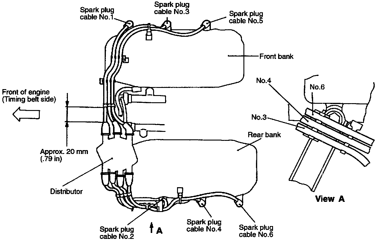 Improper arrangement of spark plug cables will induce voltage between the cables, causing miss firing and developing a surge at acceleration in high-speed operation. Therefore, be careful to arrange the spark plug cables properly by the following procedure.