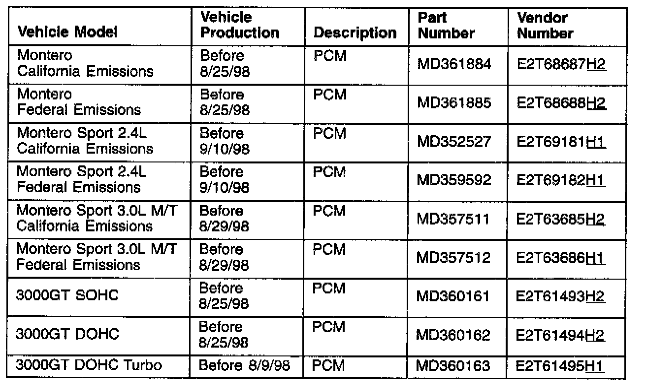 This bulletin does NOT apply to 1.5L and 1.8L Mirage models. Refer to TSB-99-13-007 for PCM reprogramming instructions for these models.