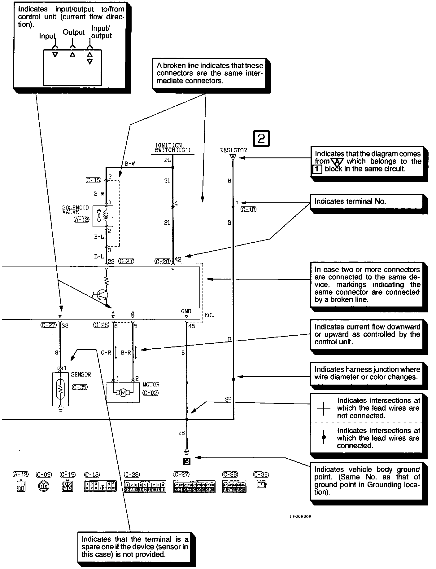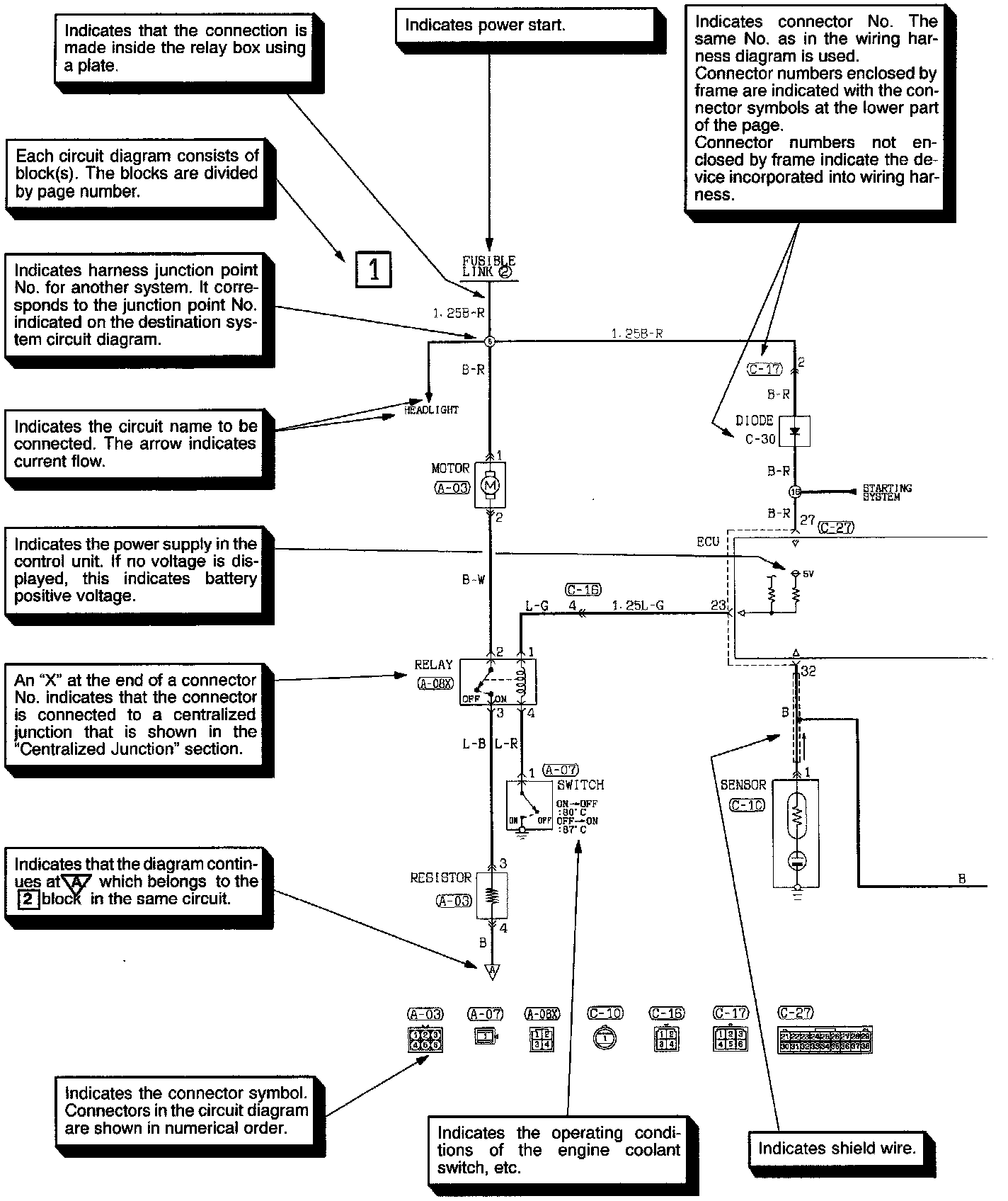 The circuit of each system is shown from the fuse (or fusible link) to ground. The power supply is shown at the top and the ground at the bottom to help understand of how the current flows.