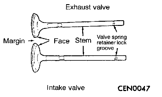 2. Inspect the remaining margin after the valves are refaced. Exhaust valves with less than 0.95 mm (0.0037 inch) margin and intake valves with less than 1.05 mm (0.0413 inch) margin should be discarded and replaced.