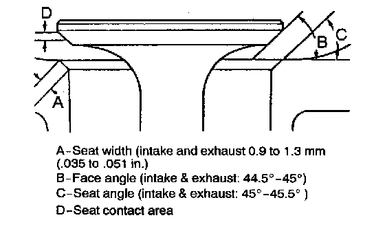 When seat is properly positioned, the width of intake and exhaust seats should be 0.9 to 1.3 mm (0.035 to 0.051 inch).