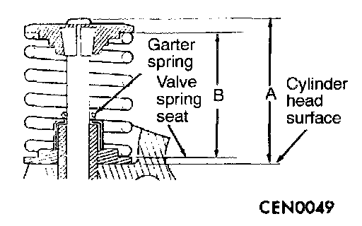 8. Check the valve spring installed height B after refacing the valve and seat. Make sure measurements are taken from top of spring seat to the bottom surface of spring retainer. If height is greater than 38.00 mm (1.496 inch), install a 0.762 mm (0.030 inch) spacer in head counterbore under the valve spring seat to bring spring height back within specification.