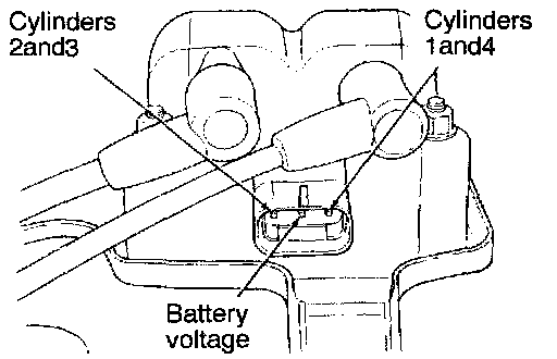 IGNITION COIL PACK CHECKCoil one fires cylinders 1 and 4. Coil two fires cylinders 2 and 3. Each coil tower is labeled with the number of the corresponding cylinder.