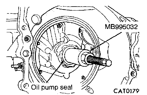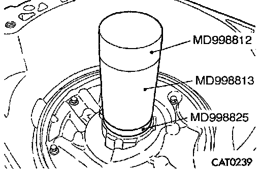 Install new oil pump seal with Installer Cap MD998812 Installer 100 MD998813 and Installer Adapter (52) MD998825.