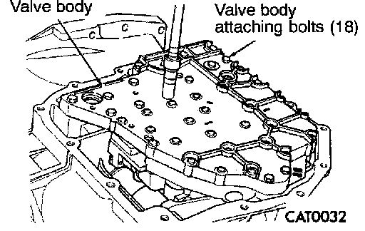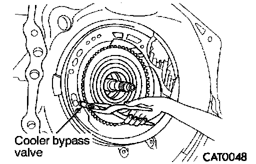 11. Put a dab of petrolatum on the top of low/reverse accumulator piston. Using a smooth-surface bar or equivalent, press the bar evenly against the petrolatum so it sticks to the piston. Pull out the piston.