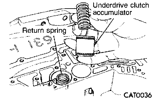 7. Remove underdrive clutch accumulator and overdrive clutch accumulator with return springs and seal rings.