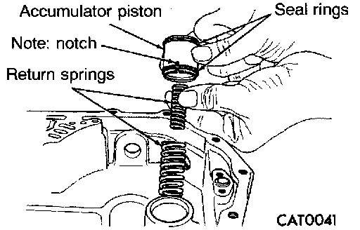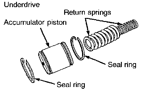 8. Remove return spring (overdrive) or two return springs (underdrive) and two seal rings from the overdrive and underdrive clutch accumulator pistons.