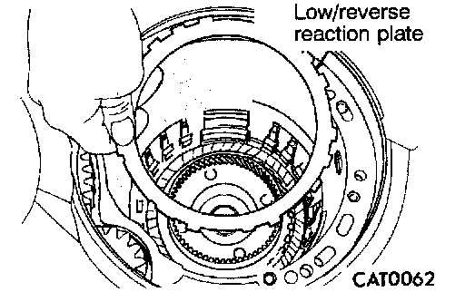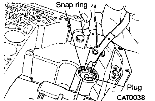 9. Remove the snap ring holding the low/reverse accumulator plug (cover) in place.