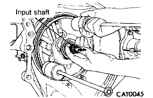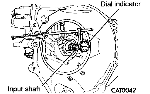 Attach a dial indicator to transaxle bell housing with its plunger seated against end of input shaft.
