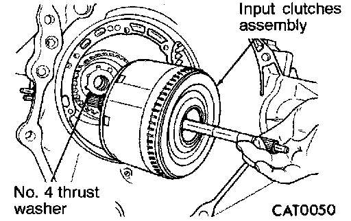 13. Measuring input shaft end play before disassembly will usually indicate when a No. 4 thrust plate change is required (except when major parts are replaced). The No. 4 thrust plate is located behind the overdrive clutch hub.