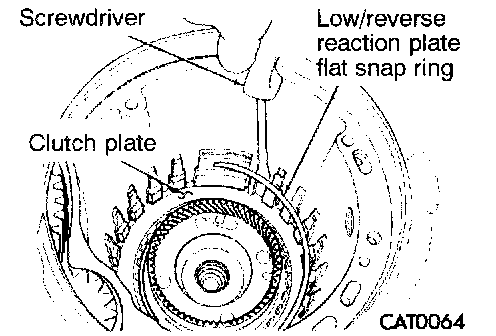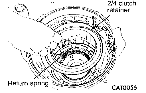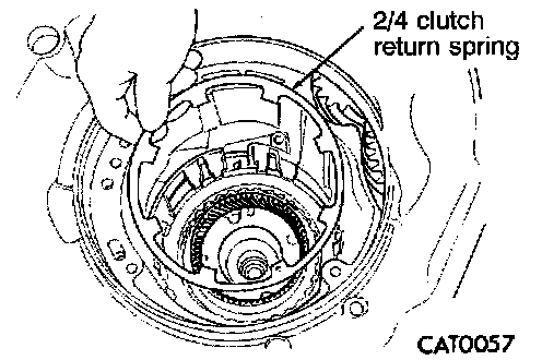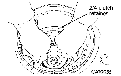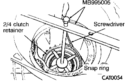 26. Install spring compressor MB995005. Using the special tool, compress the 2/4 clutch retainer just enough to remove the snap ring. Using a screwdriver, remove the 2/4 clutch retainer snap ring.
