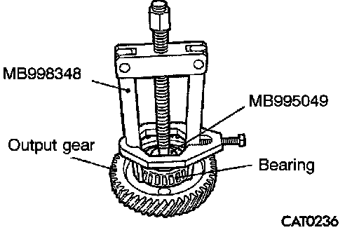 53. Install Bearing and Gear Puller MD998348 and Button MB995049 on output gear bearing to remove bearing.