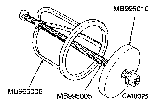 56. Use center bolt of Spring Compressor MB995005, Spring Compressor MB995006 and Disc MB995010 to assemble low/reverse spring compressor tool.