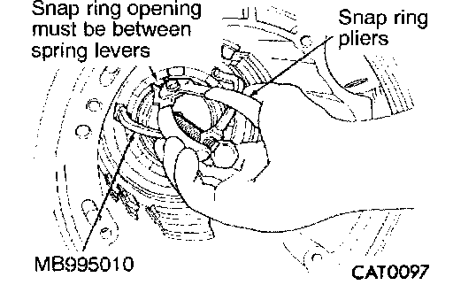 57. Install compressor tool to transaxle as shown. Compress low/reverse piston assembly. Position Spring Compressor MB995005 to allow access to snap ring.