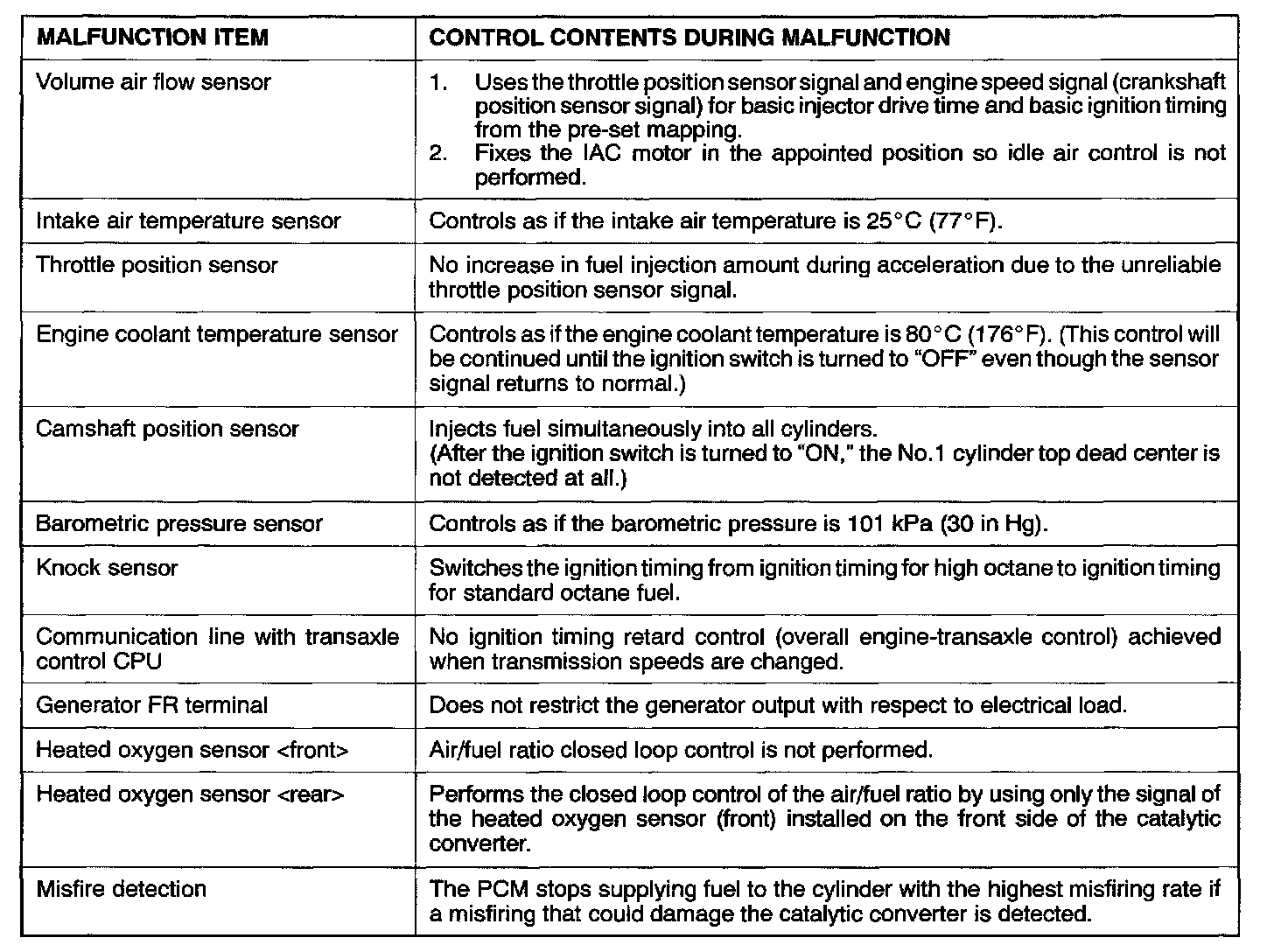 When the main sensor malfunctions are detected by the diagnostic test mode, the vehicle is controlled by means of the defaults.