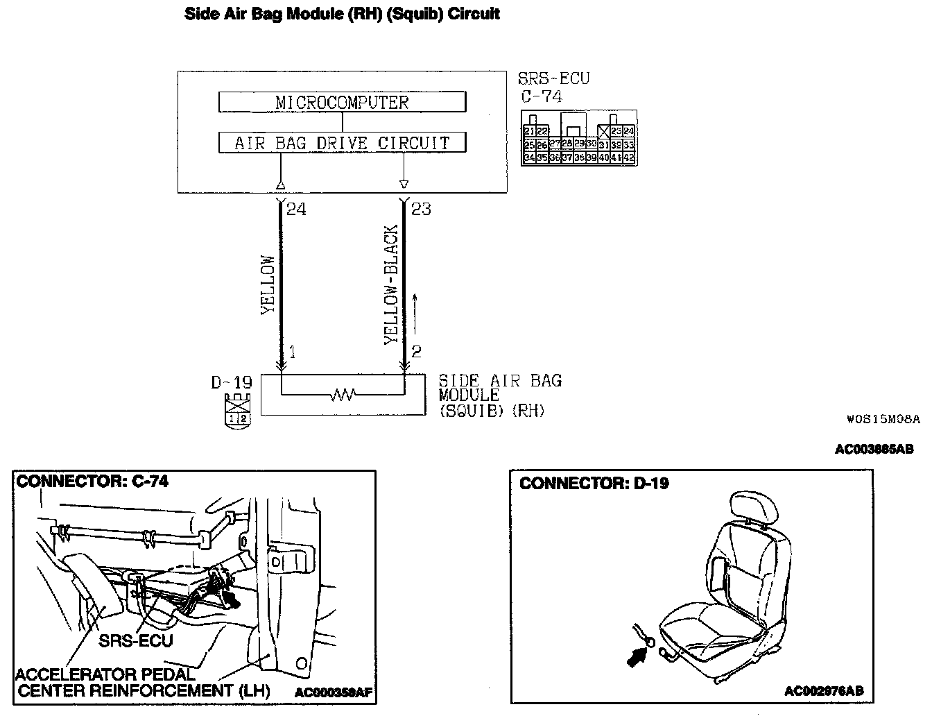 STEP 2. Check the harness wires between SRS-ECU connector C-74 and side air bag module (RH) connector D-19.