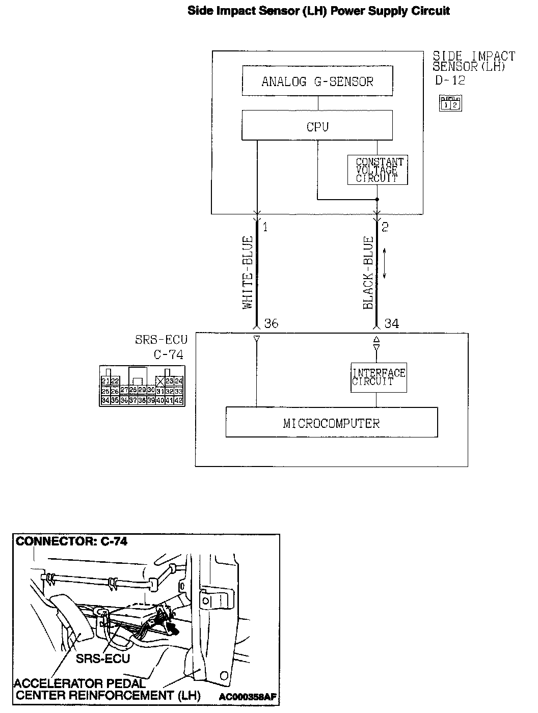 STEP 2. Check the harness wires between SRS-ECU connector C-74 and side Impact sensor (LH) connector D-12.